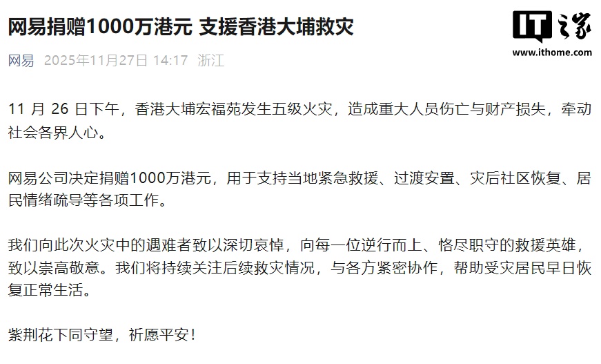 网易公司决定捐赠 1000 万港元,用于支持当地紧急救援、过渡安置、灾后社区恢复、居民情绪疏导等各项工作。